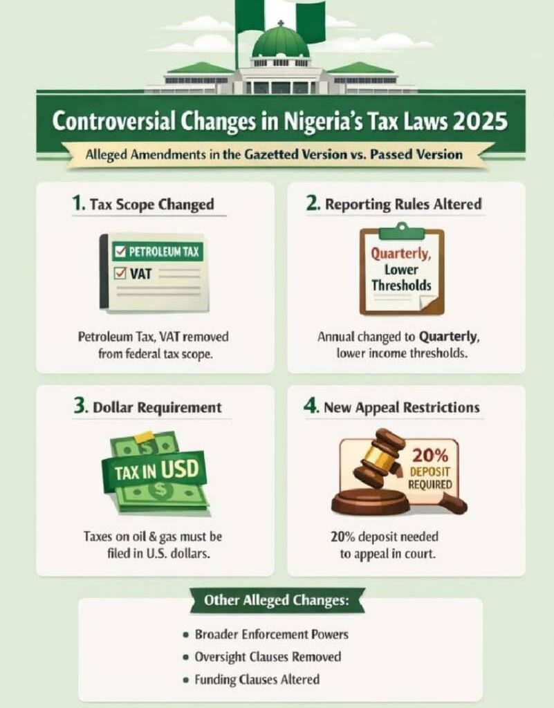 Wahala don deu smell near di tax reform law even bifor January 1st go start cus wetin National Assembly pass nor be wetin come out to public.